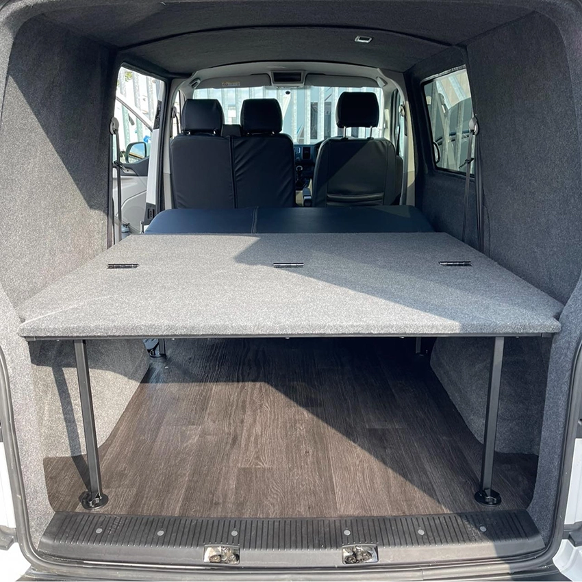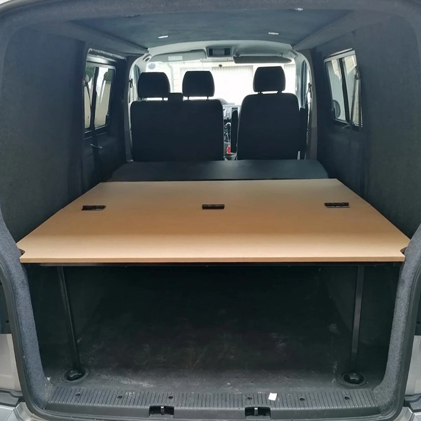 Easily upgrade your VW van into a cosy camper with our quick-install Plywood Bed Conversion Kit. This Kombi bed conversion kit turns your van into a functional camper. Featuring pre-cut 18mm ply boards, customisable to match your personal style and van’s needs. Ideal for both sleeping and storage, the bed platform is full-width and folds in half, maximising space in your Transporter. Our affordable kit offers both quality and versatility, making it the perfect addition to your van.